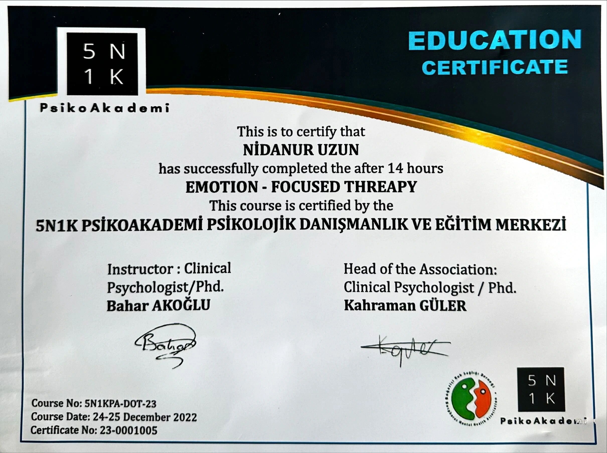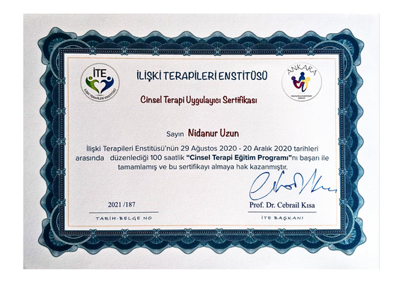 Lisans eğitimi boyunca Prof. Dr. Mazhar Osman Ruh ve Sinir Hastalıkları hastanesinde ve Başakşehir Devlet hastanesinde stajlarımı tamamladım. 2021 yılında İstanbul Nişantaşı Üniversitesi Klinik psikoloji tezli yüksek lisans programına başladım. Yüksek Lisans eğitimi boyunca özel eğitim ve rehabilitasyon merkezlerinde kurum psikogu olarak görev yaptım. Uzmanlığımı ‘Erken dönem bağlanma stillerinin ilişkilerde manipülasyon ve dürtüsellik ‘ üzerine yazdım ve bu araştırmamı 9th INTERNATIONAL NEW YORK CONFERENCE ON EVOLVING TRENDS IN INTERDISCIPLINARY RESEARCH & PRACTICES kongresinde sundum. 3 yıldır aktif olarak danışan görmekteyim. Şuanda İstanbul beşiktaşda kendi kliniğimi açtım ve danışanlarım ile yüzyüze ve online çalışmaya devam etmekteyim.