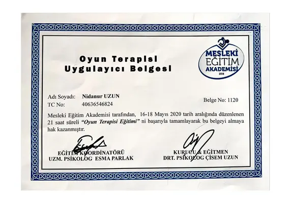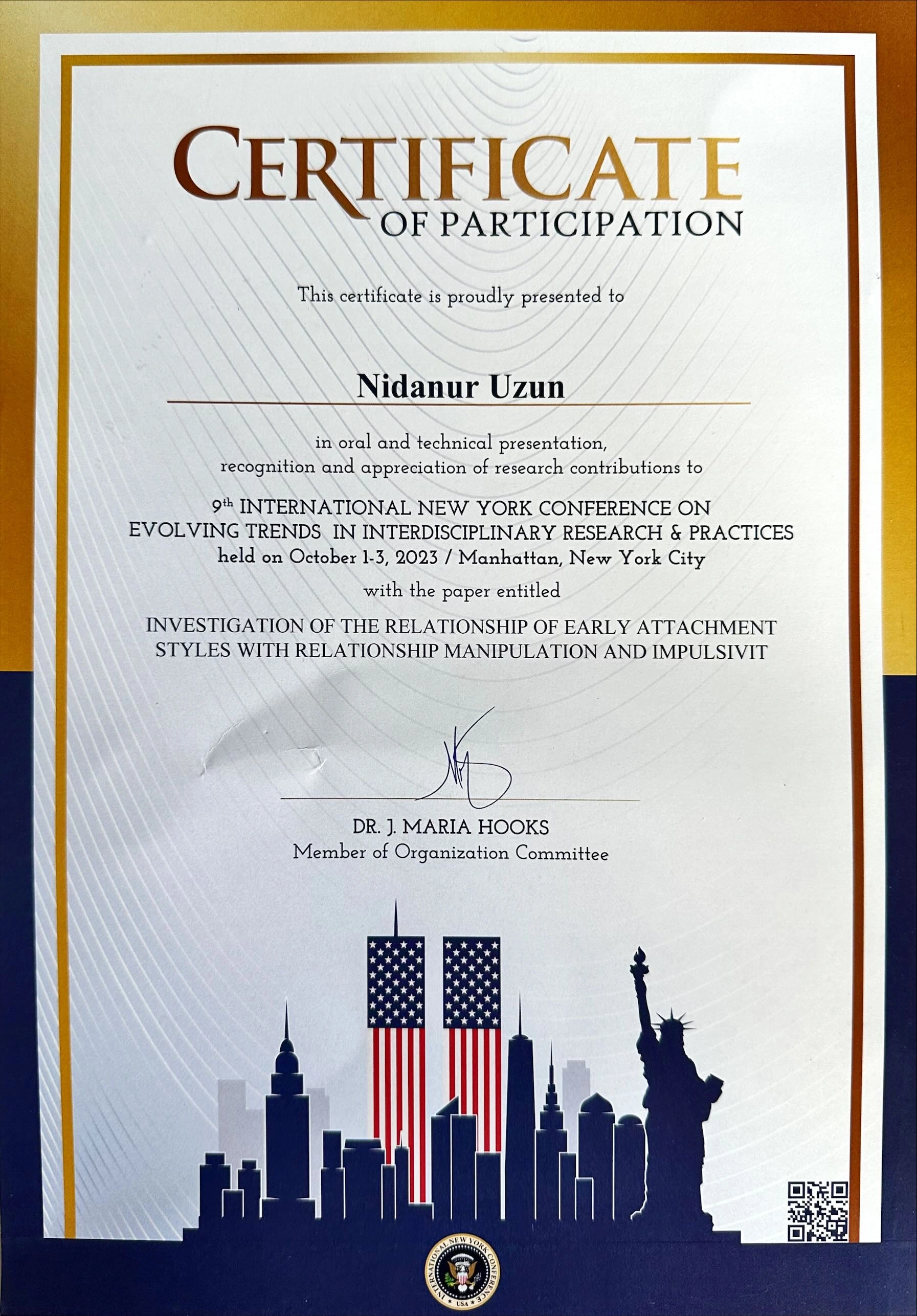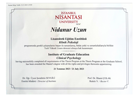 Lisans eğitimi boyunca Prof. Dr. Mazhar Osman Ruh ve Sinir Hastalıkları hastanesinde ve Başakşehir Devlet hastanesinde stajlarımı tamamladım. 2021 yılında İstanbul Nişantaşı Üniversitesi Klinik psikoloji tezli yüksek lisans programına başladım. Yüksek Lisans eğitimi boyunca özel eğitim ve rehabilitasyon merkezlerinde kurum psikogu olarak görev yaptım. Uzmanlığımı ‘Erken dönem bağlanma stillerinin ilişkilerde manipülasyon ve dürtüsellik ‘ üzerine yazdım ve bu araştırmamı 9th INTERNATIONAL NEW YORK CONFERENCE ON EVOLVING TRENDS IN INTERDISCIPLINARY RESEARCH & PRACTICES kongresinde sundum. 3 yıldır aktif olarak danışan görmekteyim. Şuanda İstanbul beşiktaşda kendi kliniğimi açtım ve danışanlarım ile yüzyüze ve online çalışmaya devam etmekteyim.